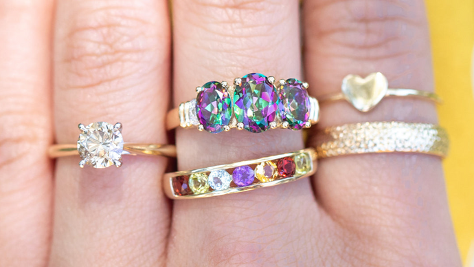 If you like sticking to one cohesive look and style, this is the way to go for you. Create a balance of rings across your fingers and keep ring size and style in mind. Go for an all-gold look with one of two diamonds or gemstones spread out across both hands. Make your rings blend in with the rest of your personal style.