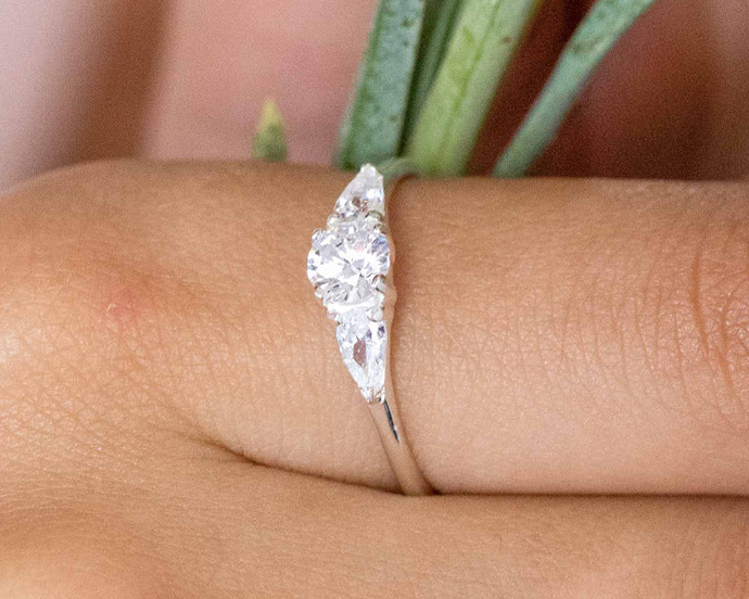 A three-stone ring is a type of ring that features three stones that are arranged into a line or triangle along the centre of the ring. On a three-stone ring the centre diamond or gemstone is usually larger than the two side stones. Three-stone rings have been a popular choice for centuries and continue to be a popular choice among jewellery lovers today. The three stones are also said to represent the past, present, and future. Three-stone rings are more affordable than single-stone solitaire rings and offer a different style with more variety and options to choose from.