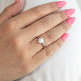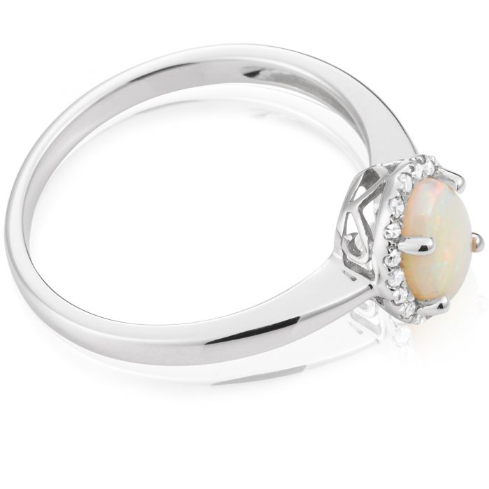 9ct White Gold 0.45ct Natural White Opal and Diamond Halo Ring
