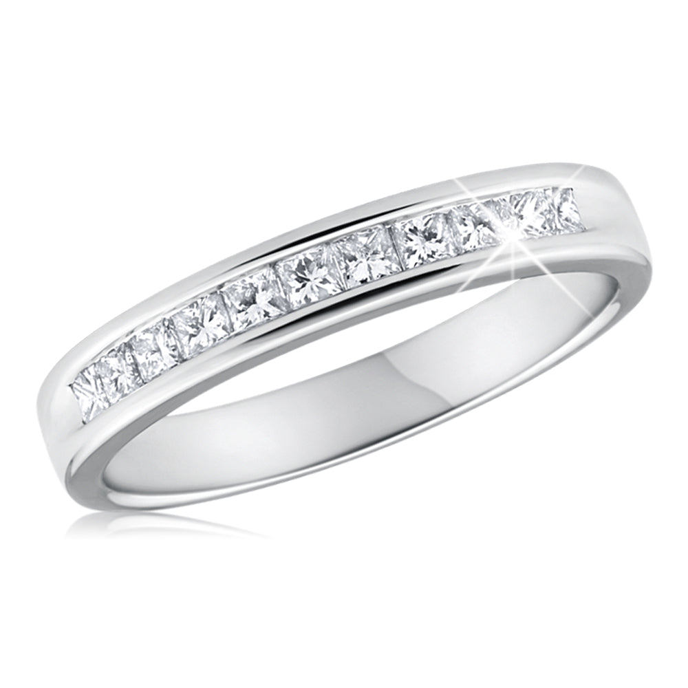 Sparkle with delight in this beautiful 9ct White Gold 1/2 Carat Diamond Ring With 11 Princess Cut Diamonds. A stunning wedding band that will compliment any engagement ring, this ring is simple, yet glamorous. Glittering princess cut diamonds sit in a channel setting, which is perfect for everyday wear. Show her just how much you love her with a diamond ring that will be treasured for a lifetime.