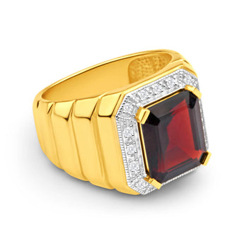 9ct Yellow Gold 12x10mm Emerald Cut Garnet and Diamond Halo Gents Ring