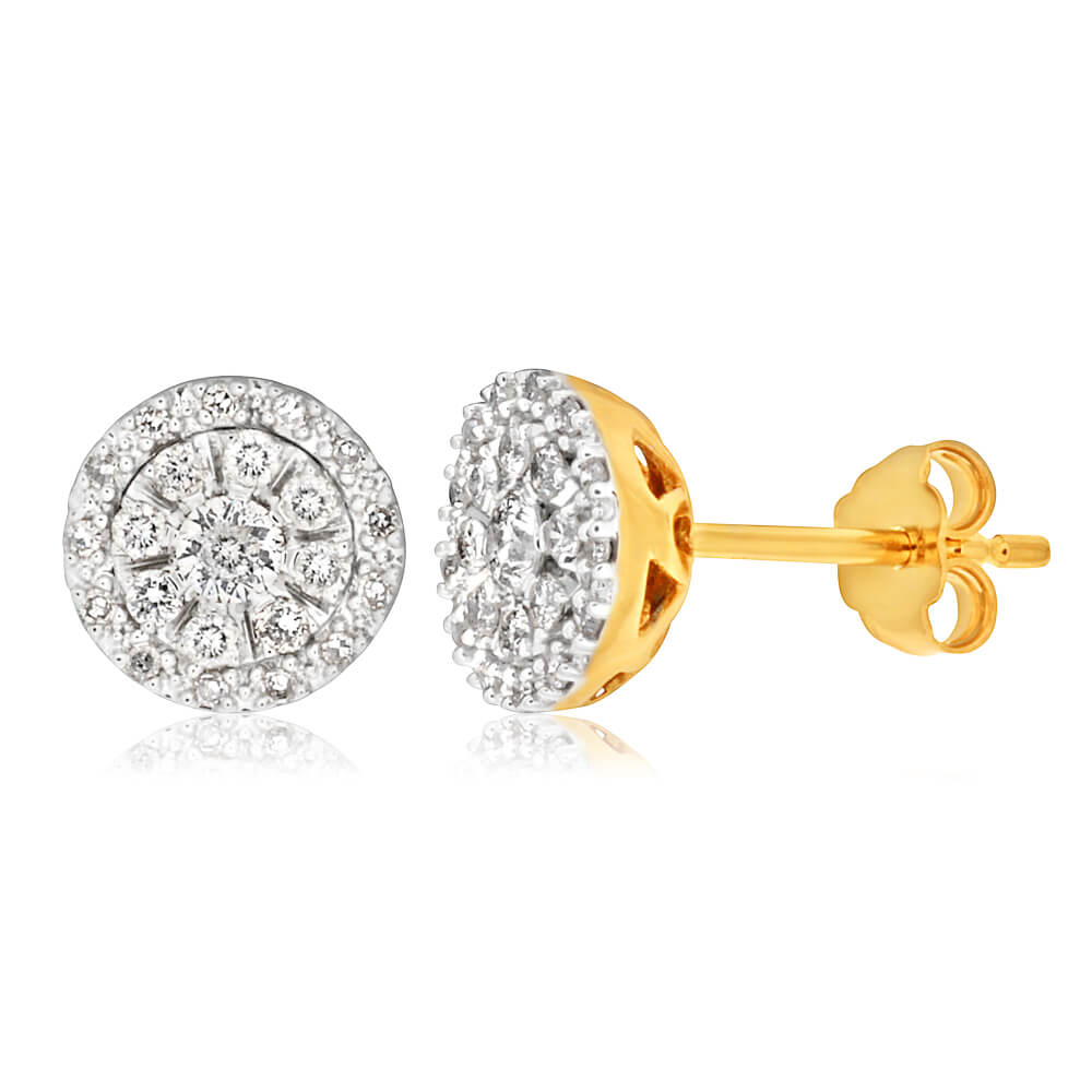 Stand out from the crowd in these 9ct Yellow Gold Brilliant Diamond Stud Earrings. This pair is made for the diamond lovers, with an array of beautiful white diamonds layered across their face. They'll shine and glimmer under the sun and light, giving you a stunning glow. Crafted from 9ct yellow gold for comfortable feel and top-end durability. If you are looking for the right gift, these are the perfect choice.