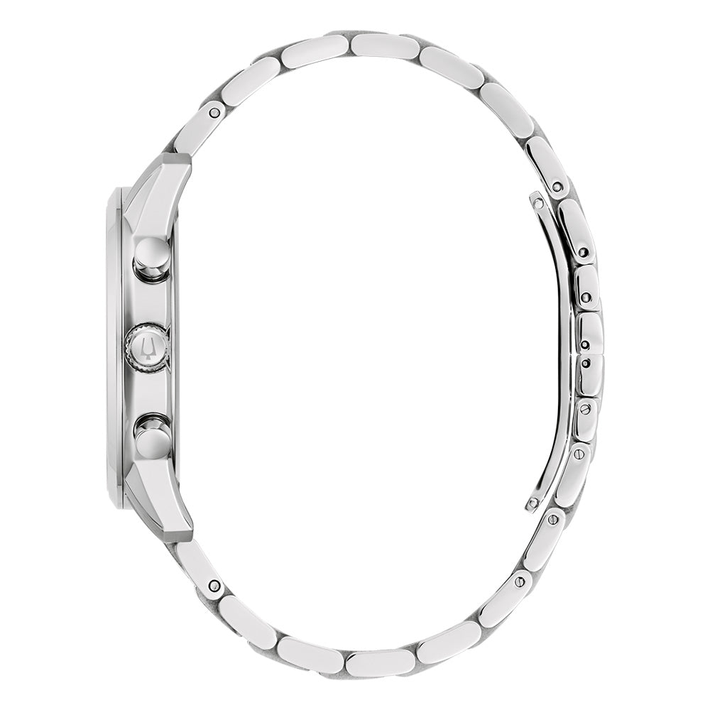 Powered by the Bulova 0S10 Quartz movement, which operates on a reliable battery, the chronograph can precisely time events up to 12 hours to the nearest second. The watch features a comfortable 41mm case size with a slim 9.7mm thickness and a lug width of 20mm. The domed mineral crystal further protects the dial, ensuring clarity and scratch resistance.