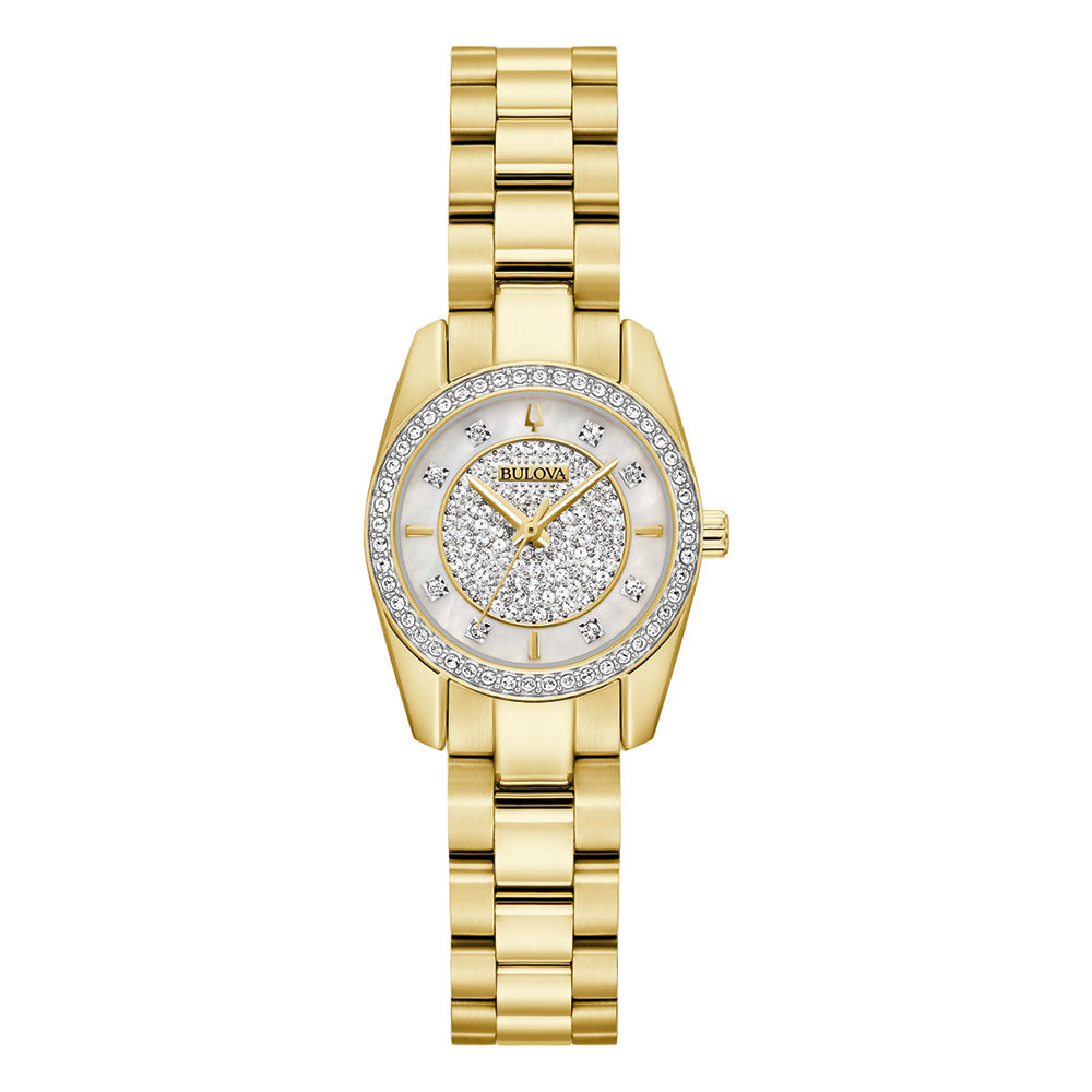 The mother-of-pearl dial exudes luxury, showcasing gold-tone details, 8 crystal hour markers, and a pavé-style center adorned with 102 meticulously set crystals. It’s paired with a matching gold-tone stainless steel bracelet and a deployant clasp for a seamless finish.
