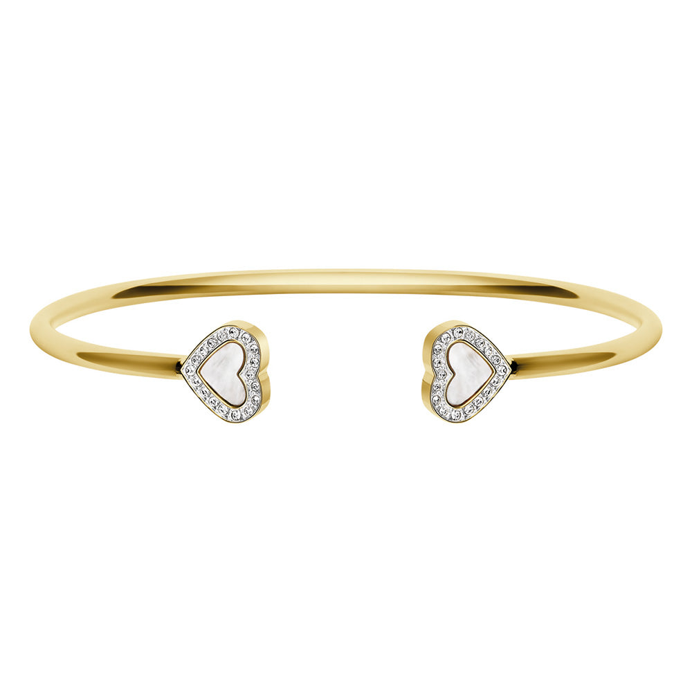 Completing the set are two stylish bracelets: a gold-tone memory bangle featuring mother-of-pearl hearts framed by 36 crystals, and a modern bolo chain bracelet with alternating mother-of-pearl and pavé crystal hearts, set with a total of 38 crystals.