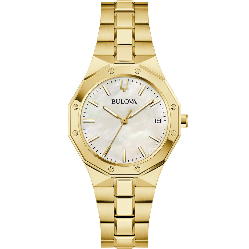 The radiant mother-of-pearl dial is accented with gold-tone hands and applied markers filled with Super-LumiNova for enhanced visibility, along with a discreet date display for added function.