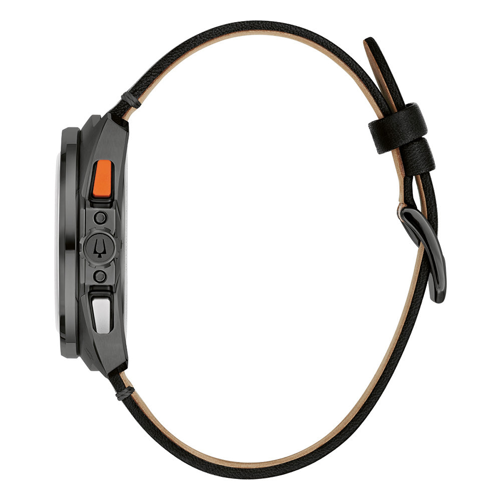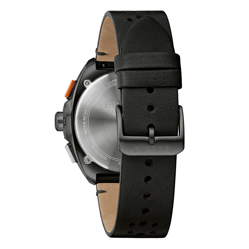 Finished with a perforated black leather racing strap and pin buckle closure, the Bulova Racer is a dynamic blend of function and style—perfect for the track or everyday wear.