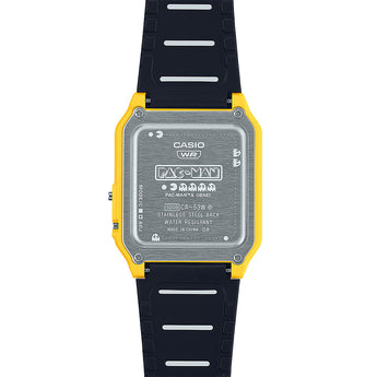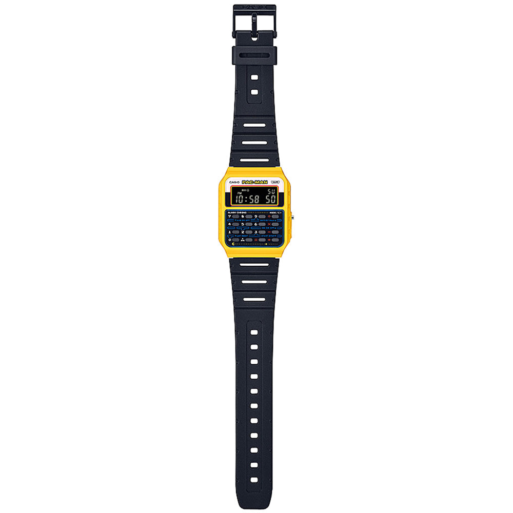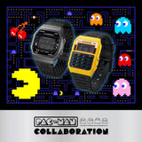 The dial of this model is designed to resemble a PAC-MAN game stage, with characters moving around the face. The vibrant yellow case is inspired by the classic arcade game machine, and the case back features engravings of PAC-MAN characters and the game logo. The band is made from bio-based resin, reducing environmental impact, while the packaging is designed to resemble an arcade game machine.