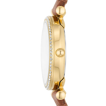 Powered by a precise quartz movement, this watch has a compact 28mm case size, offering a delicate yet sophisticated look. The stainless-steel case ensures durability, while the 12mm leather strap provides a comfortable fit. The mineral crystal protects the dial, and the 50 meters of water resistance make it both fashionable and practical for everyday wear.