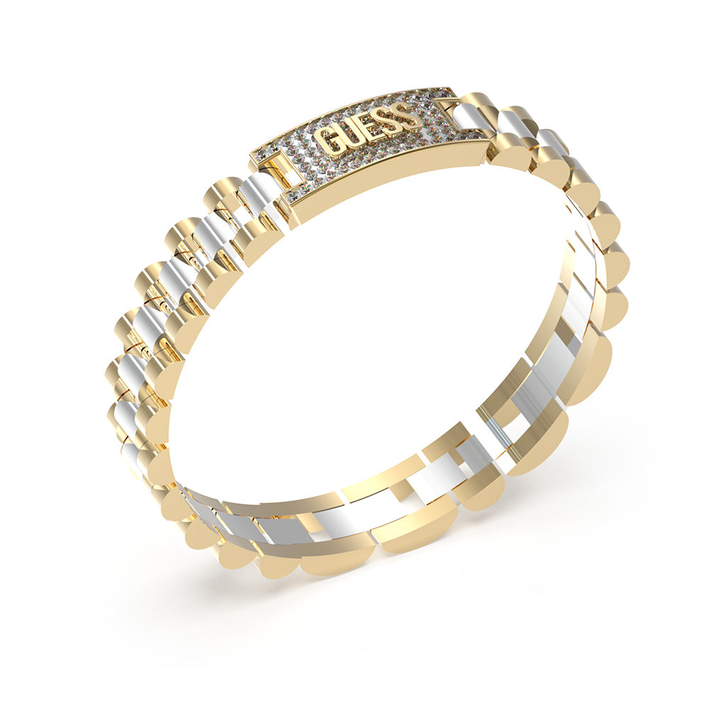Guess Mens Jewellery Stainless Steel Gold Plated 10mm Pave Tag Empire Bracelet