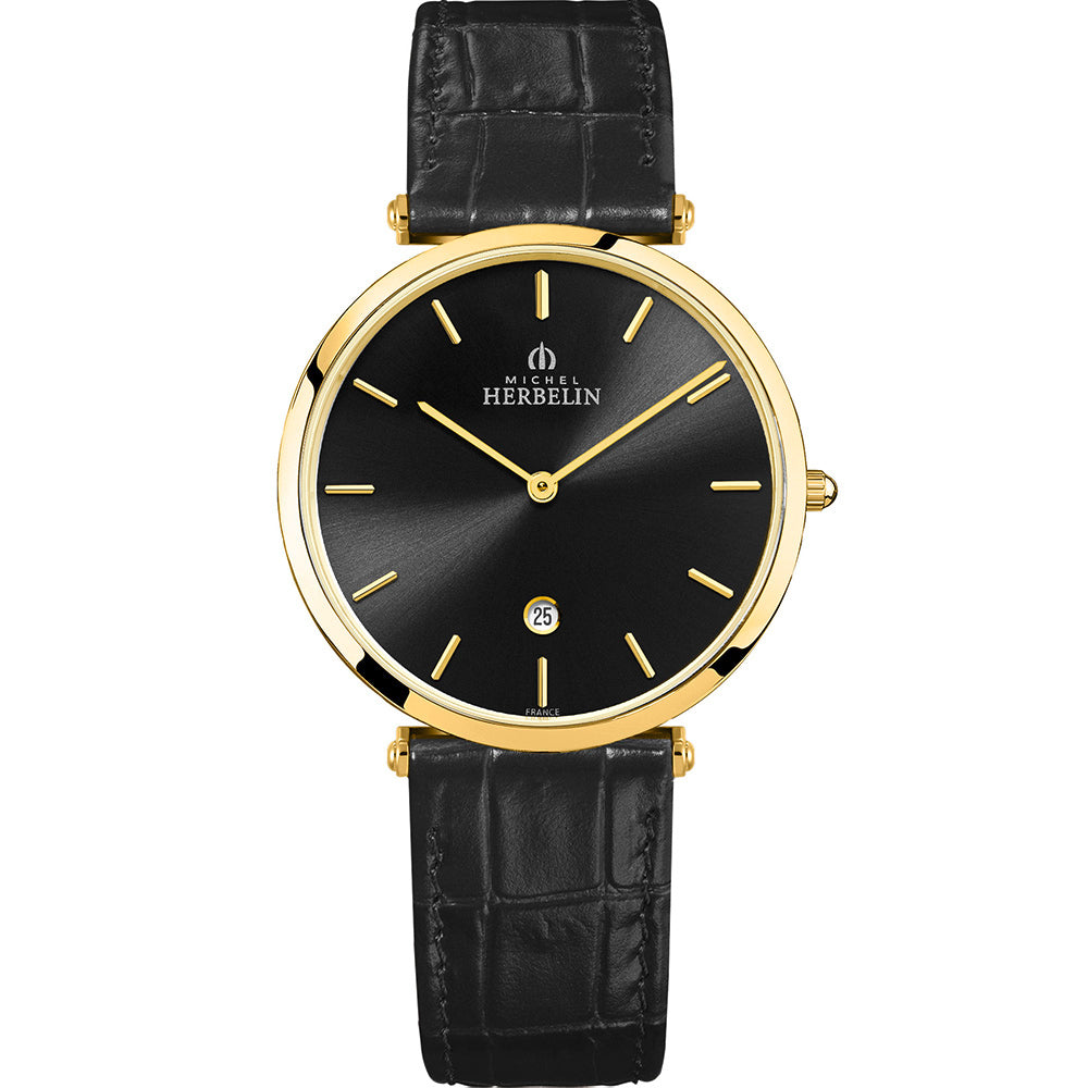 Check out this stunning women’s watch from Michel Herbelin, the 19406/P14N Epsilon is a dressy women’s watch that is perfect for those occasions when you want someone special or maybe you’re trying to add a luxurious flair to your everyday. The watch features a premium gold-plated stainless steel case that has been paired with a crocodile black leather strap. The timepiece has a minimalist aesthetic with a thin bezel and simple gold hour indices and hour indicators. The black dial has been set with a date window at 6 o’clock, which is perfect for getting more information about your day at the glance of the wrist.